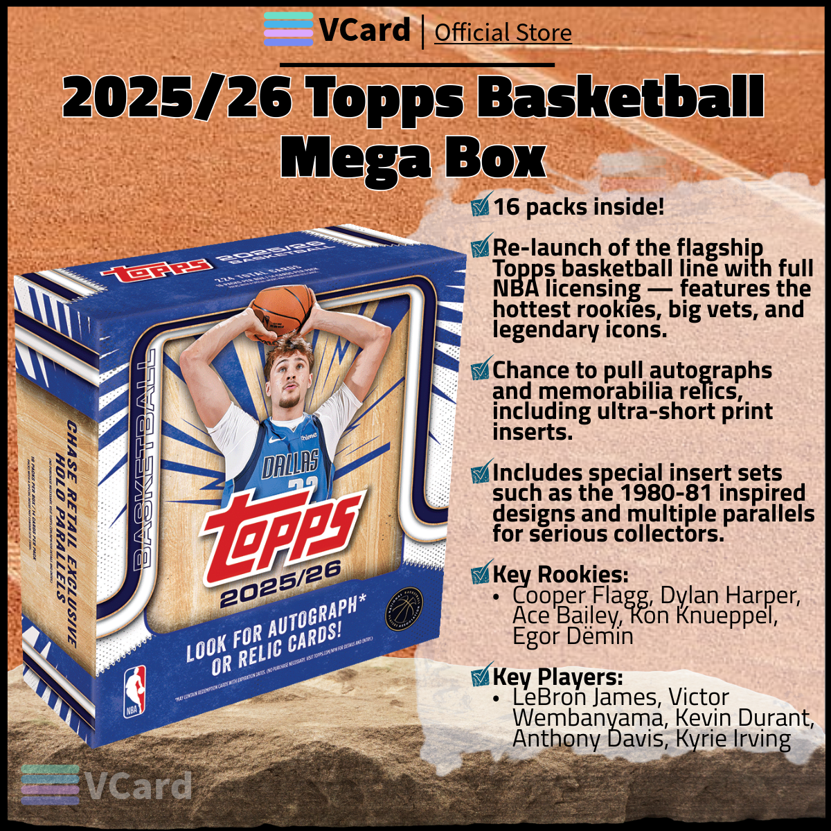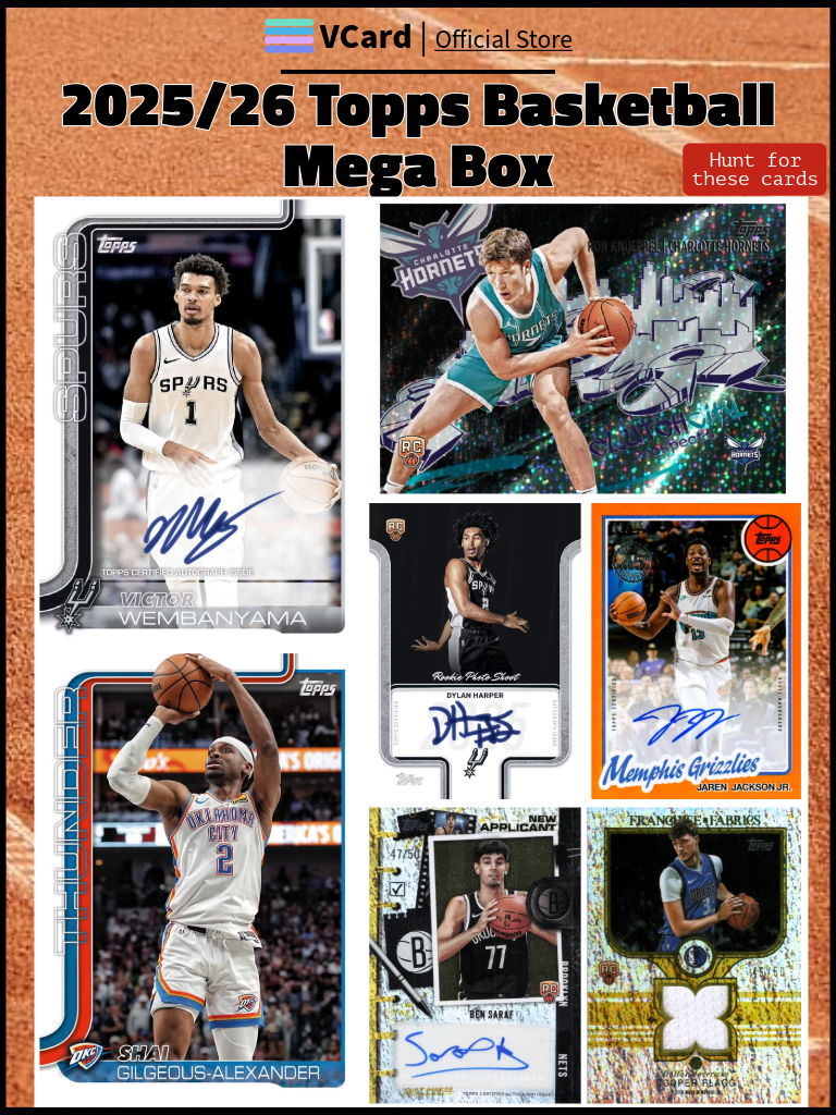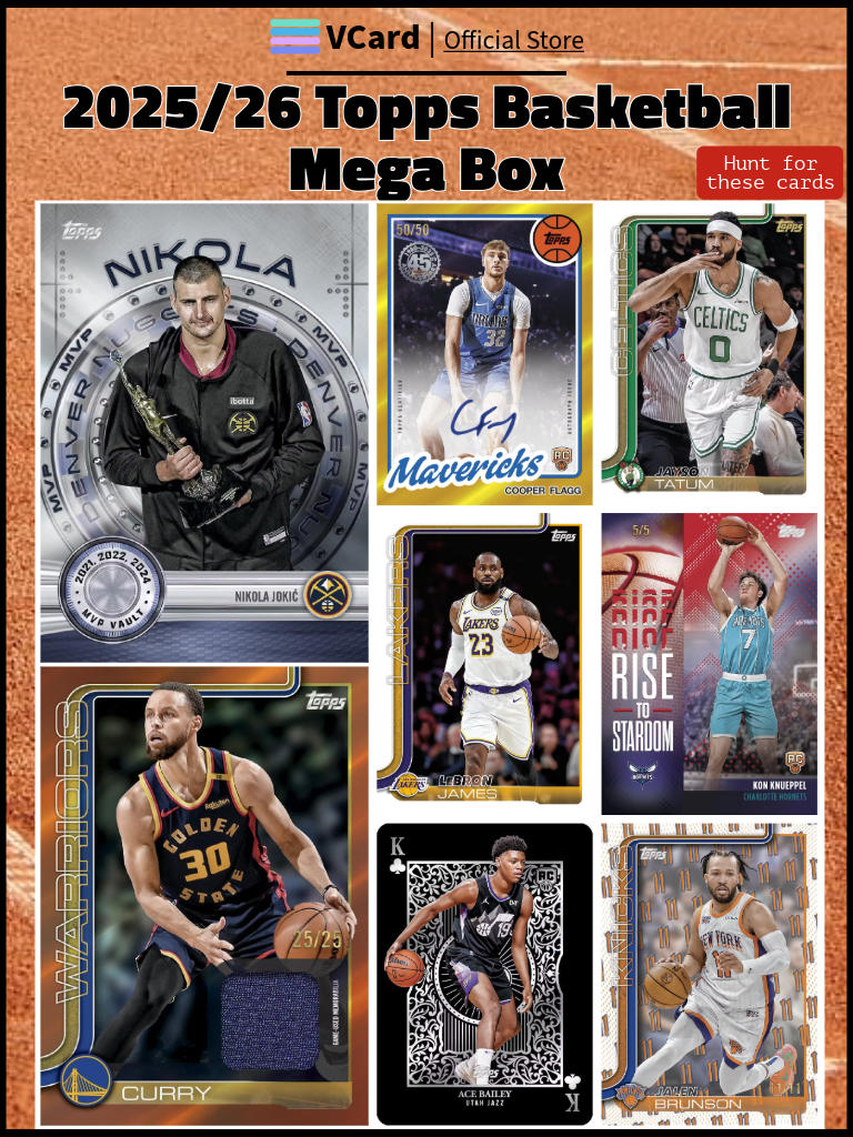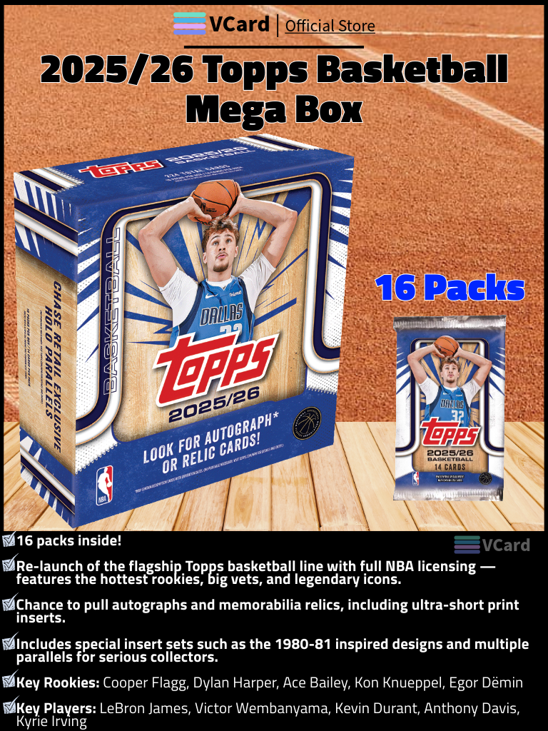 ★ The 2025/26 Topps Basketball Mega Box brings the flagship Topps basketball brand back with full force, offering a 300-card base set featuring rookies, current stars, and legends.